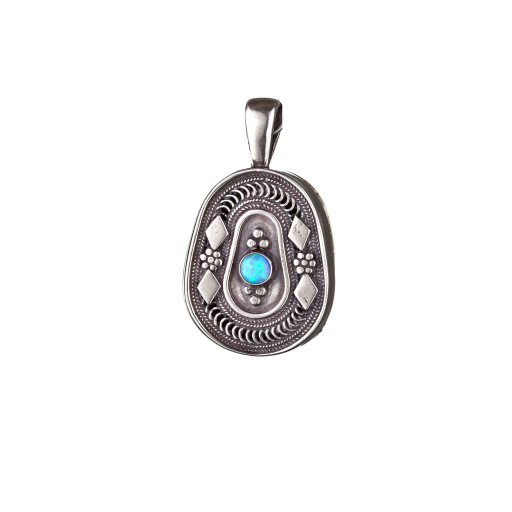 תליון קמע נפתח עם עיטורי פיליגרן תימני משובץ אבן חן. פיליגרן היא טכניקת צורפות ייחודית שמבוססת על חוטי כסף דקים שזורים זה בזה ובתליון זה ישנם גם מוטיבים תימניים מסורתיים כמו מעויינים ופרחים. מיוצר בעבודת יד בבית המלאכה ביפו העתיקה. בעת ההזמנה ניתן להוסיף לקמע קלף.