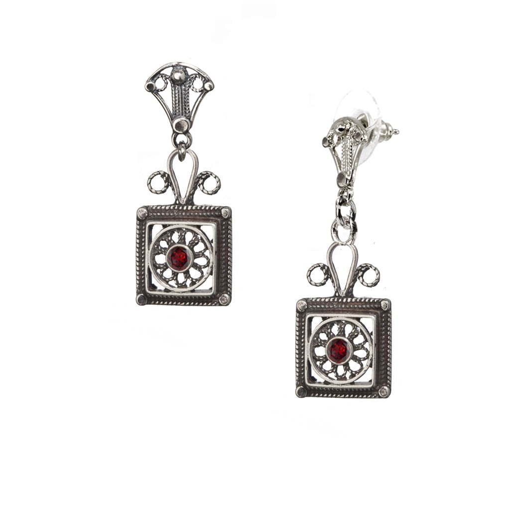 עגילי כסף מרובעים מעוטרים בפרח ומשובצים אבן חן. עגילי כסף אלגנטיים בעיצוב מרובע עם פרח עדין במרכז ושיבוץ אבן חן. העגילים מעוצבים בטכניקת פיליגרן, שכוללת חוטים דקים שזורים זה בזה בעבודת יד. העיצוב המוקפד והקווים הנקיים מעניקים לעגילים מראה קלאסי ומלא אופי, מתאים גם ליום יום וגם לערב. העגילים מיוצרים בבית המלאכה ביפו העתיקה.