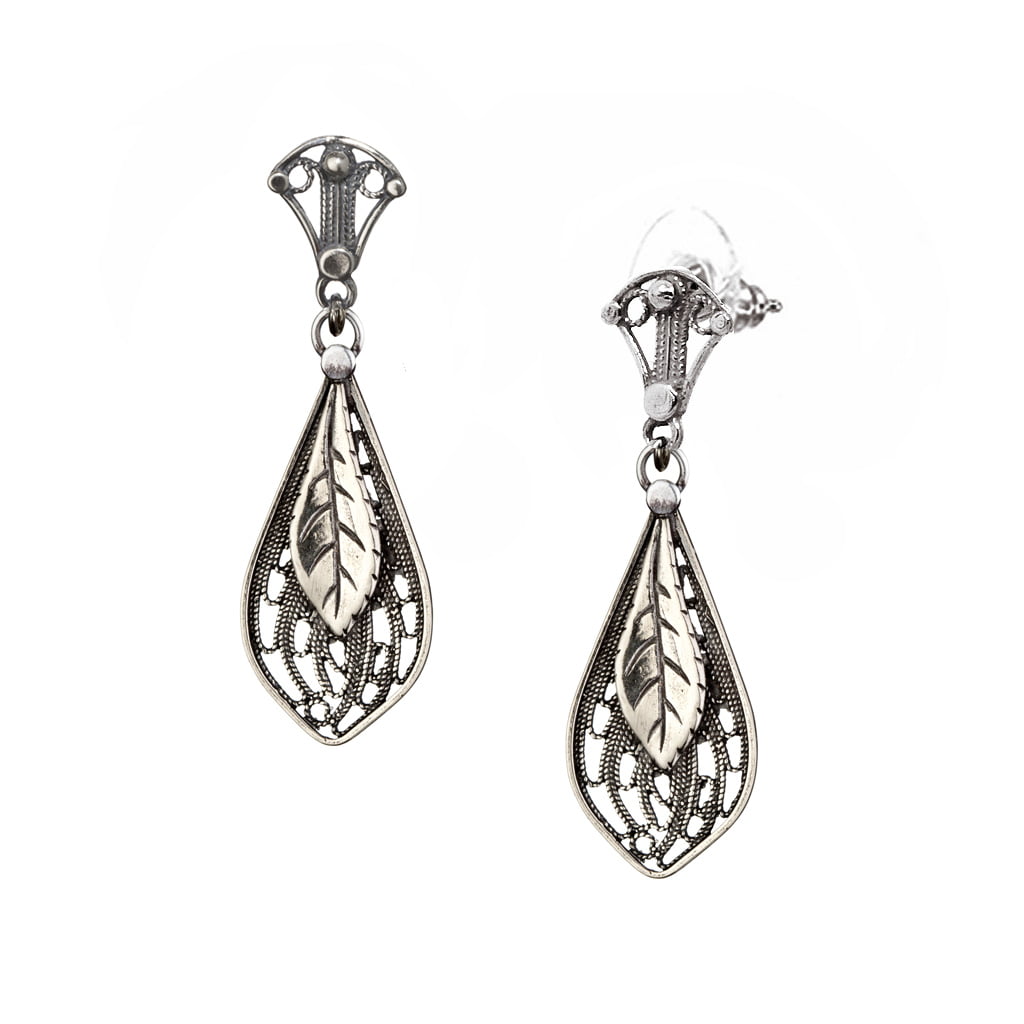 Lovely leaf drop earrings filled with lacy filigree. Available in silver or gold overlay. Design the top as a hook, filigree post or screw back for people without pierced ears. Measures 4cm length x 1.4cm width Handmade in Israel