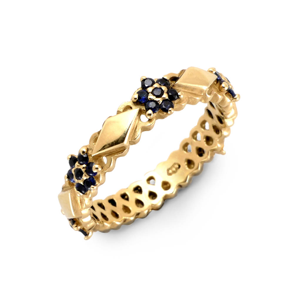 Solid Gold Yemenite Filigree Ring Set With Sapphires. This finely handcrafted ring has the beauty of the traditional Yemenite filigree pattern, with intricate diamond shapes and delicate floral patterns set with brilliant blue sapphires. The design radiates elegance and timeless style. Available in your choice of solid 14K or 18K yellow gold.